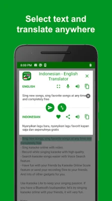 Indonesian - English translator is an application that help you lookup dictionary and translate words and sentences from Indonesian to English, or translate English to Indonesian too. This translator is free and you are able to translate words or sentences quickly, conveniently and easily.