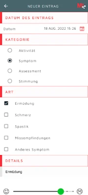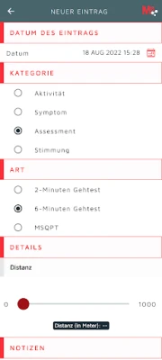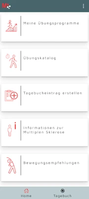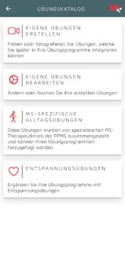 Es gibt die Möglichkeit, bestehende Übungen zu benutzen. Übungen können auch als Video mit Übungsanweisungen der Therapeuten aufgenommen oder durch Fotos mit Beschreibung erstellt werden. Ausserdem kann das Tagebuch eingesetzt werden, um persönliche Fortschritte zu dokumentieren. Die Tagebucheinträge werden informativ, teils anhand von Grafiken, aufbereitet und dargestellt. Die App vermittelt in kompakter Form wichtige Informationen und Empfehlungen über MS, über das Leben mit MS und über Sport und Training bei MS.