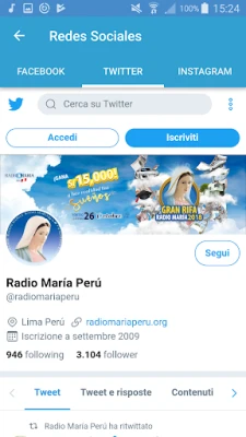 El 28 de abril de 1994, Fiesta de San Luis María de Monfort. se inicia el camino en Radio Santa Rosa con una hora diaria a las once de la noche con un programa denominado “Radio María por Radio Santa Rosa” El 13 de mayo de 1995 en presencia de sacerdotes y laicos se constituyó la Asociación Radio María. Nuestro nacimiento como miembro oficial de la Familia Mundial de Radio María significó el primer eslabón en Latinoamérica. En julio de 1995 recibimos la bendición apostólica del Papa Juan Pablo II. Y el presidente de Radio María Italia, Emanuelle Ferrario, confirmó el apoyo para Radio María en el Perú. Contamos con 46 repetidoras en Perú.